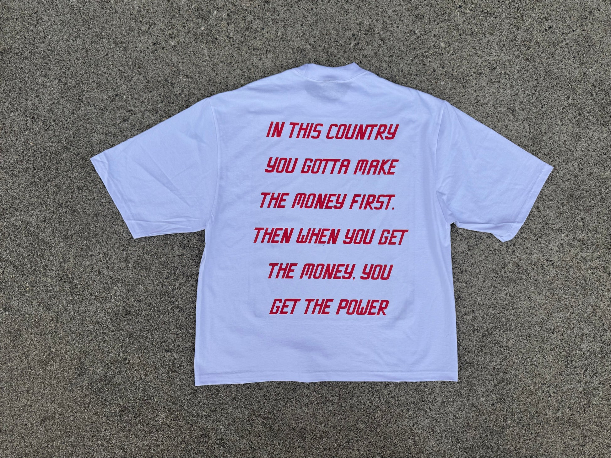 - Back: Classic Scarface quote in striking red text – “In this country, you gotta make the money first. Then when you get the money, you get the power.”